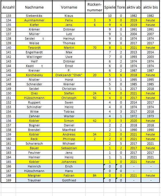 Aktuell aktive Spieler sind gelb hinterlegt, unsere Gründungsmitglieder sind blau hinterlegt.